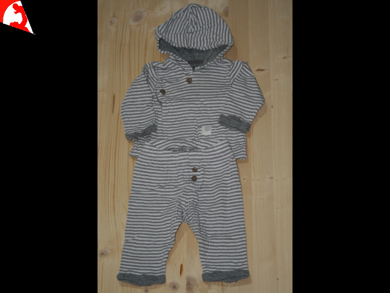 Tuta in cotone medio spessore con motivo a righe grigio chiaro e scuro e bottoncini in legno