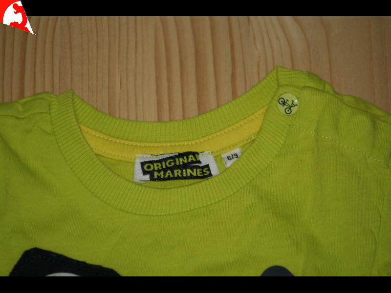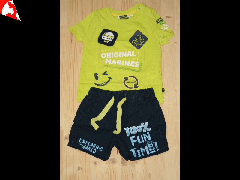 Completino in cotone con maglietta verde con varie stampe e calzoncino blu scuro con stampa
